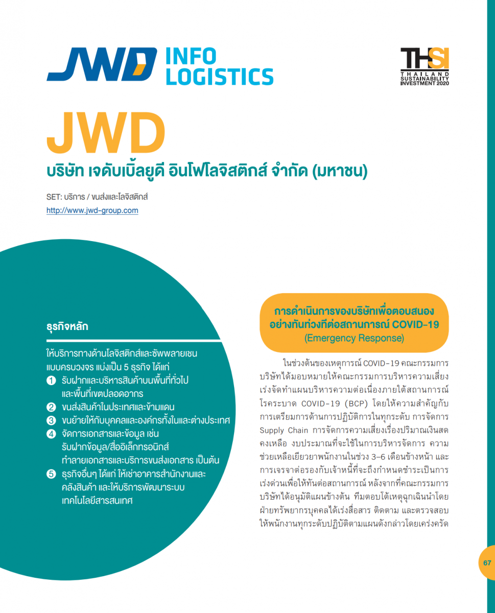 จากสถานการณ์การแพร่ระบาดของ COVID-19 JWD Group เป็นอีกกลุ่มบริษัทที่ให้ความสำคัญและเร่งดำเนินมารตการต่างๆ เพื่อป้องกันไม่ให้สถานการณ์ดังกล่าวส่งผลกระทบต่อผู้มีส่วนเสียของบริษัท หรือส่งผลกระทบน้อยที่สุด ซึ่งบริษัทได้มีการให้ข้อมูลกับตลาดหลักทรัพย์ เพื่อจัดทำข้อมูลเรื่องการจัดการภาวะวิกฤตจากสถานการณ์ COVID-19 เพื่อรวบรวมข้อมูลการดำเนินงานของบริษัท และบริษัทจดทะเบียนอื่นๆ ที่จะเผยแพร่ให้เป็นประโยชน์ในการเรียนรู้เรื่องการเตรียมความพร้อมการจัดการธุรกิจในภาวะวิกฤตต่อไป ดังรายละเอียดตามด้านล่างนี้